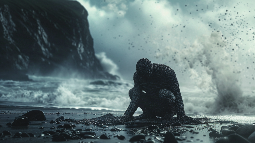 Not long after Malin Kundang departed again, the sea turned violent. Dark clouds gathered, waves crashed against his ship, and lightning split the sky. In a moment of divine retribution, a storm descended. His ship was destroyed, and Malin himself was turned into stone, forever frozen in a kneeling position of regret.